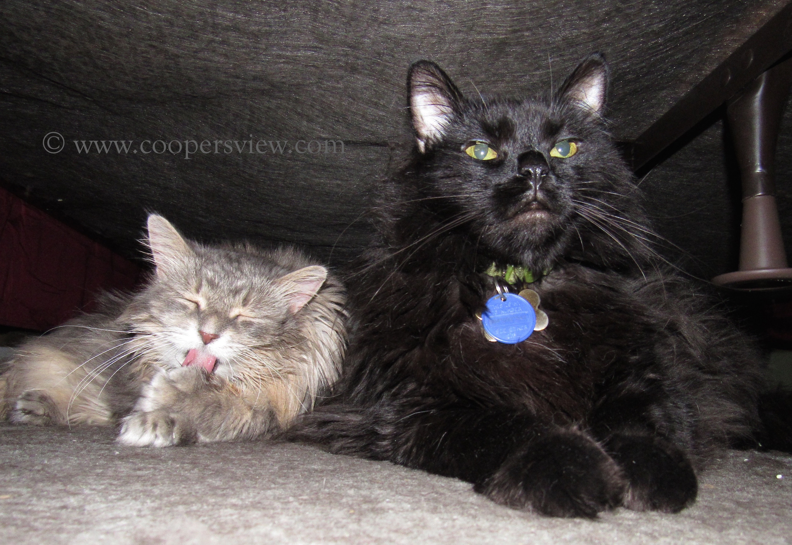 The only time these two are EVER voluntarily together, in the same room, and in the same space is during a threat of imminent destruction by the evil one known as the “Vacuum Cleaner“. Here, under the bed, we find Sebastian on the lookout for danger, while Princess Pansy takes a moment to freshen up.